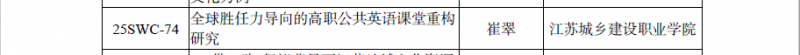 我校崔翠主持的《全球胜任力导向的高职公共英语课堂重构研究》(编号:25SWC-74)获批2025年度江苏省社科应用研究精品工程外语类课题。